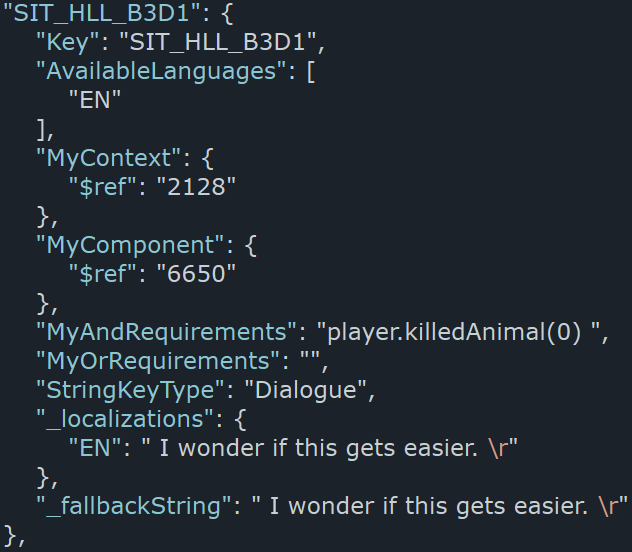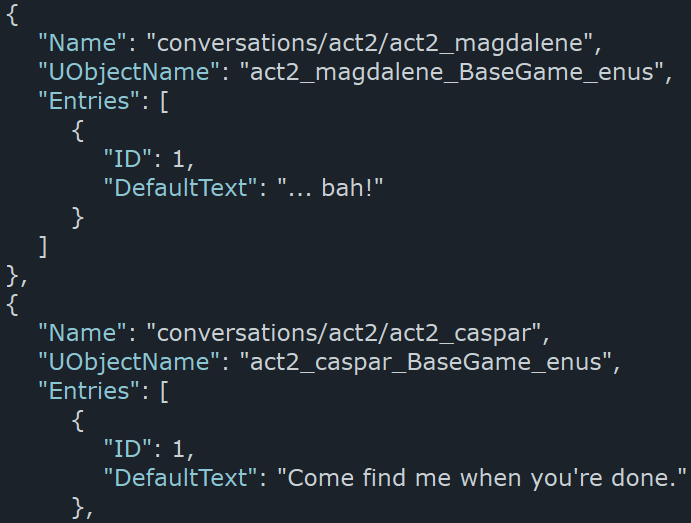 Такі .json файли також можна розпарсити та перекладати в .csv, але це робиться індивідуально для кожної гри, немає універсального інструменту, його потрібно писати власноруч, за допомогою ШІ, просити знайомих техніків або людей на дискорд серверах.